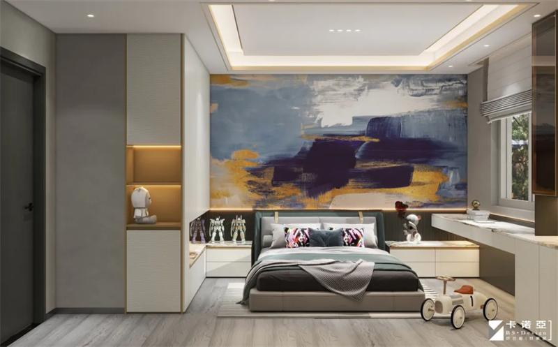 懸浮頂+燈帶吊頂設計,除了輔助照明外,還能讓空間凸顯溫馨氛圍和層次美。床頭櫃與衣櫃及書桌一體化設計,不占地兒更整體。