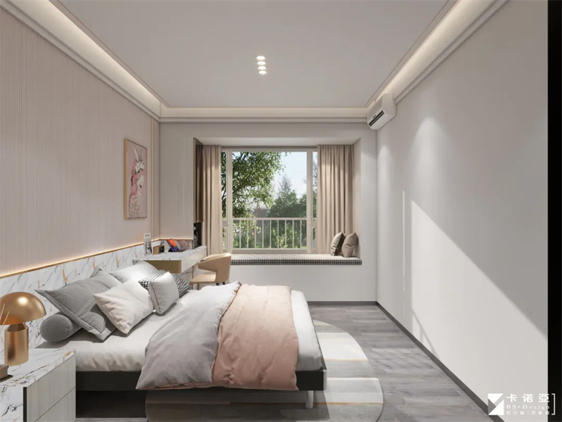 床頭處打造學習區,床頭櫃做成懸浮式書桌,與飄窗櫃一體化設計,開放格妥帖安置書本,安靜獨立學習區讓孩子一眼就心動~