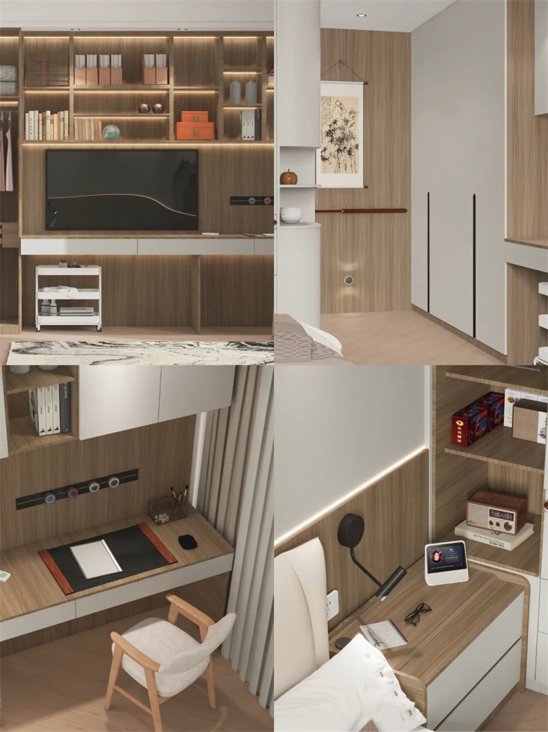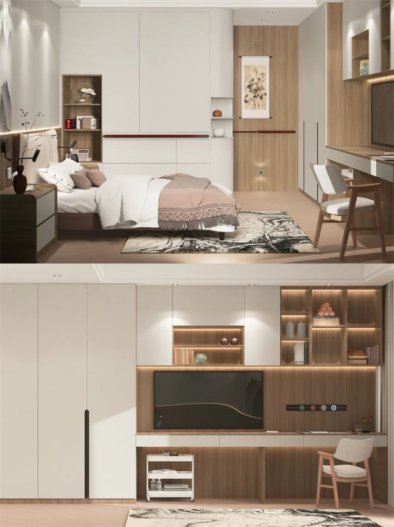 ▪️床尾選擇做衣櫃+書桌櫃一體化設計,看書、練書法、看電視,在家悠閑樂享時光?
