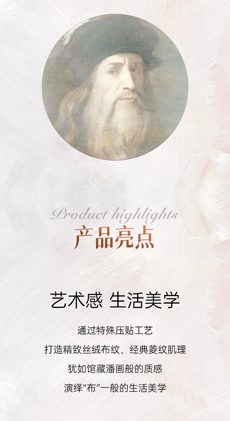 通過特殊壓貼工藝,打造精致絲絨布紋、經典菱紋肌理,猶如館藏潘畫般的質感,演繹“布”一般的生活美學