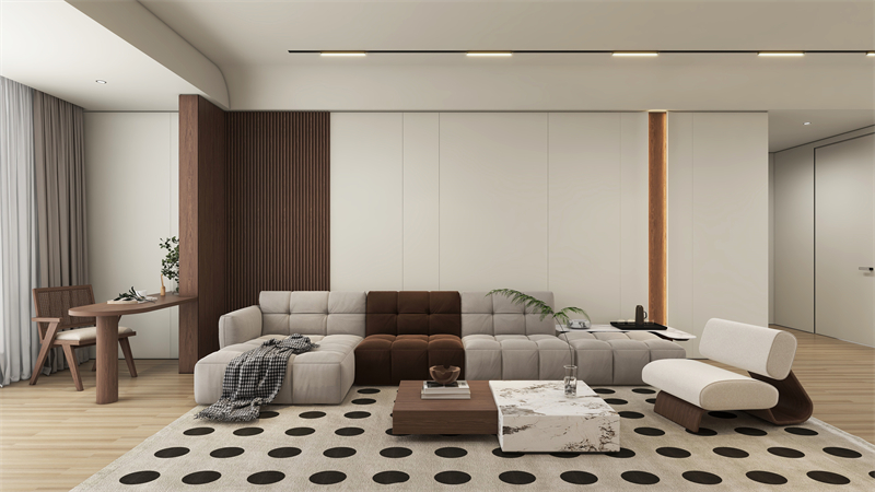 沙發背景牆采用深淺撞色設計,與電視櫃、沙發在色彩上相呼應。隔斷牆延伸的書桌,既可作為隔斷,又能辦公學習。