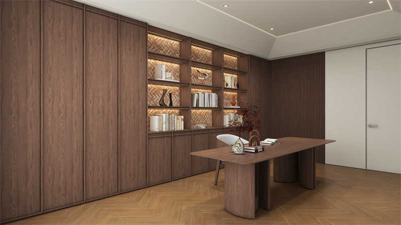 韶光係列汲取金秋的詩意靈感,煦色韶光,鎏金年華,於都市喧器中,借自然手法,將複古細膩的“清秋胡桃”棕色木皮紋理融於空間,營造高雅格調的詩意棲居空間。溫暖而深沉的棕色,細膩的紋理,自然的質感,不禁讓人聯想到秋天的寧靜,打造溫暖懷舊且質樸高雅的氛圍。