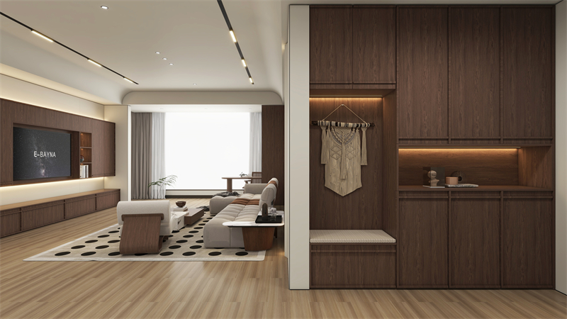 清秋胡桃與骨骼線搭配設計,從入戶起就開始鋪墊複古的基調。中間鏤空、換鞋凳的設計,讓鞋櫃實用性與裝飾性兼備,開放區集掛、坐、置三重功能於一體。