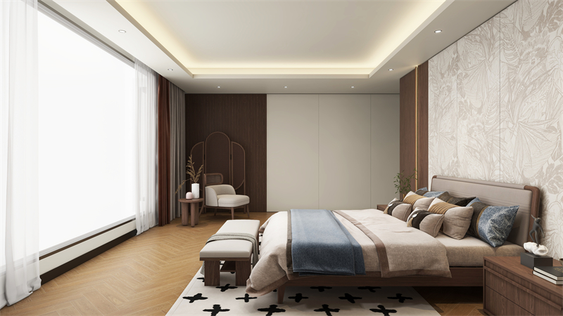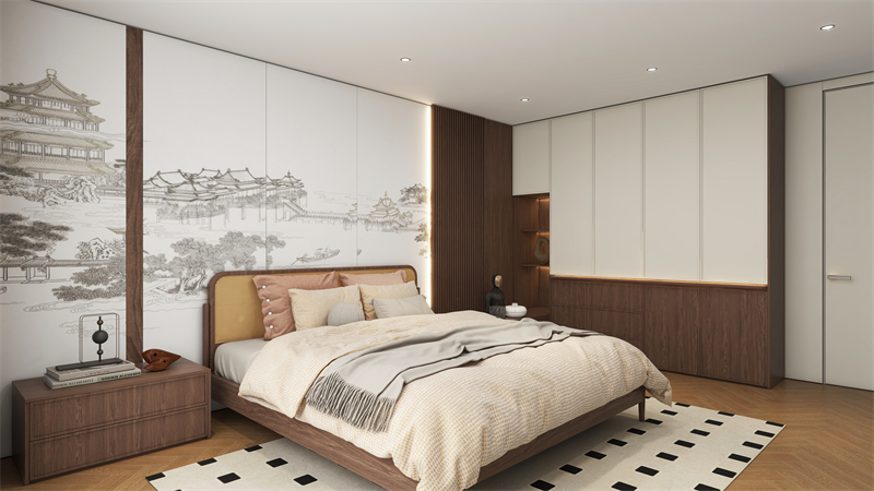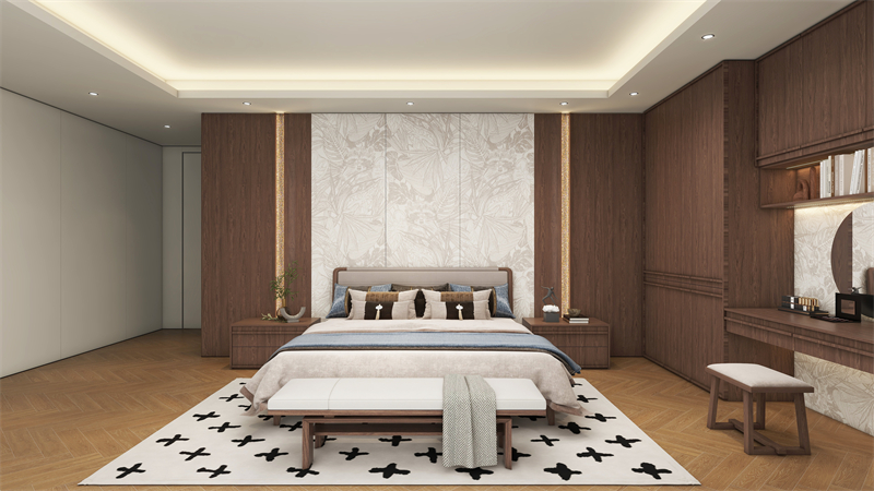 床頭背景牆清秋胡桃護牆板與藤編元素彼此呼應,立體質感的格柵板加持,將中古風的複古與雅致演繹得恰如其分。