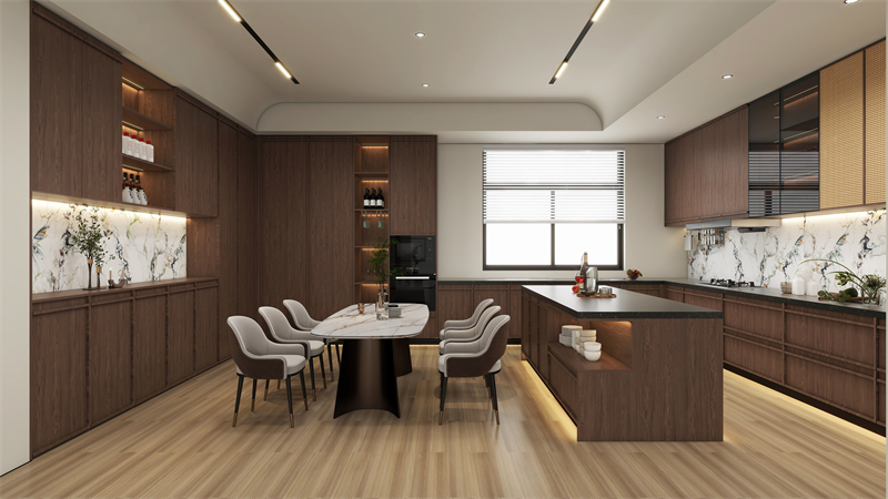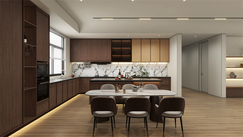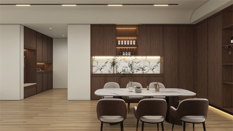 餐邊櫃和櫥櫃一體化設計,石紋背板嵌入,更顯高級感,同色同奢定製,弱化了餐廳與手机看片网站過渡的生硬感。