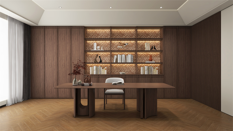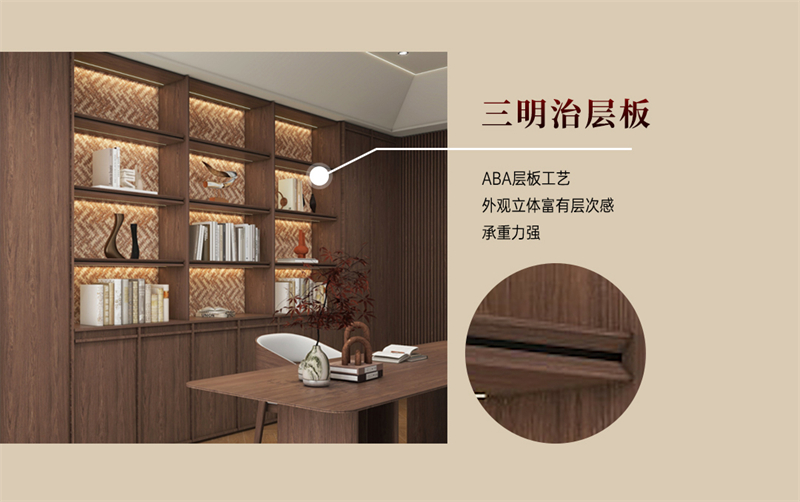 整牆書櫃巧妙地運用了骨骼門,凹凸有致的骨骼線,將線條元素與櫃體櫃門完美融合,增強視覺衝擊力。結合胡桃木的色彩紋理,營造複古的空間氛圍,勾勒中古風獨有的精致造型,彰顯別樣的藝術氣息。