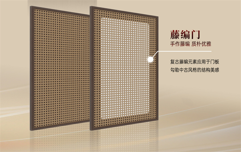 吊櫃采用手作藤編櫃門,質樸優雅,勾勒中古風格的結構美感,搭配骨骼門島台,讓空間更有質感和格調。清秋胡桃與藤編元素彼此呼應,將中古風的懷舊與精致展現得恰到好處。