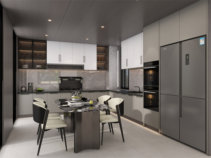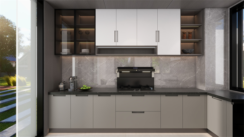 吊櫃和地櫃分別搭配“晨露白”和“薄暮灰”,中間輔以大理石紋,暖意徜徉,煙火氣撲麵而來。整體視覺幹淨大氣,玻璃門點綴,增強視覺通透感與層次感。