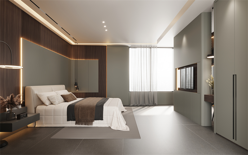 【睡眠區】床頭護牆板,一前一後采用溫暖的深木色搭配溫婉的“薄暮灰”,護牆板轉角采用圓弧過渡,優雅流暢的曲線輪廓,彰顯空間的圓潤感、高級感和立體感。柔軟舒適的寢具,讓每個追夢人沉浸美夢之中。