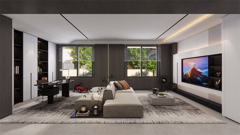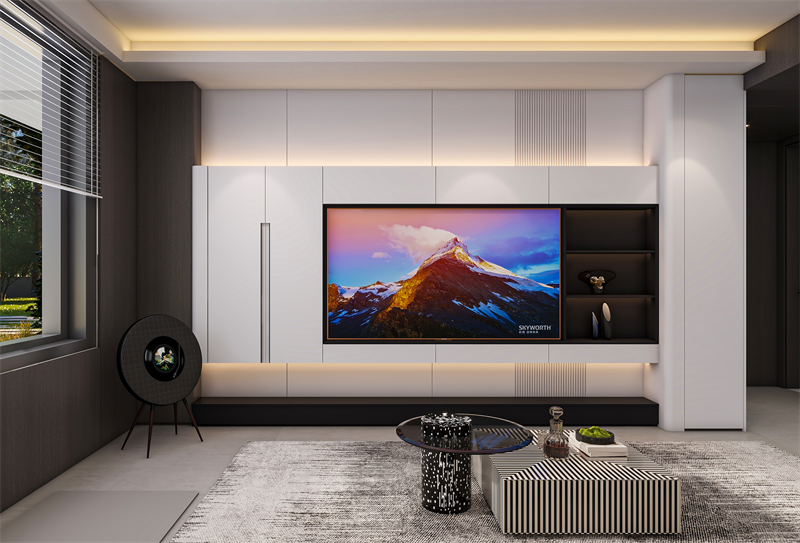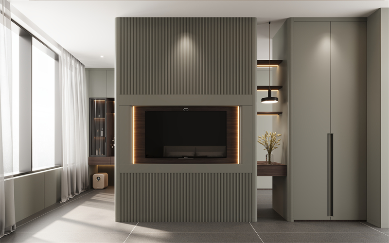 電視背景牆采用簡潔流暢的線條,與簡約的“晨露白”色彩完美融合,弧形轉角過渡,展現一種簡約而不失精致的柔美感。電視櫃采用高端定製精湛工藝,包括黑科技的懸浮設計+櫃中櫃設計+拉米諾/無孔工藝,打破傳統牆麵的厚重感,賦予空間輕盈靈動的觀感。