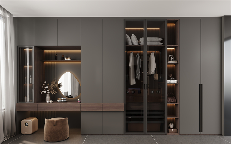 【收納區】臥室收納區設置成一個步入式衣帽間,靠牆定製一整排衣櫃+梳妝台,讓每一次的換裝都賞心悅目,為白領精英的美好形象加分,打造高顏值的精致生活。