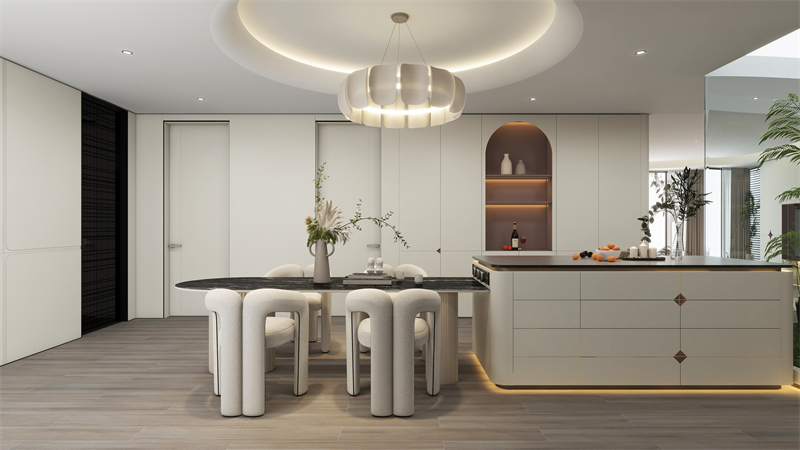 開放式餐廳布局,島台+餐桌一體化設計,富有造型的餐椅搭配,中和了空間的單一感。簡約清爽的“白芷”配色,隨處可見的三角幾何門型點綴,賦予用餐時光,更多有趣的生活情調,讓家人縱享美味佳肴。