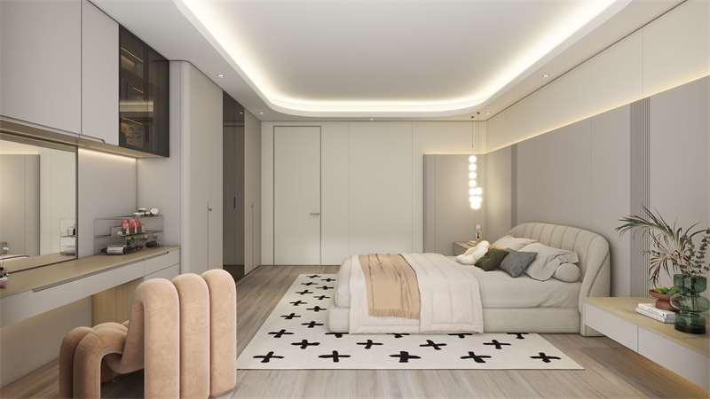 打破傳統牆麵直線條的常規設計,圓弧護牆板以更柔和的曲線語言,勾勒臥室的柔美與靜謐,搭配奶油色係軟裝,簡單耐看,營造深度睡眠的舒適環境。