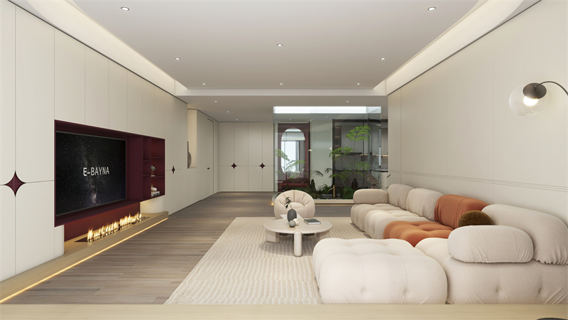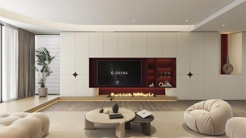 懸空電視櫃撞色設計,搭配弧狀拚接護牆板,保留奶油風溫馨基調又增添幾分和諧且富有層次感的視覺效果,讓空間輕盈靈動。