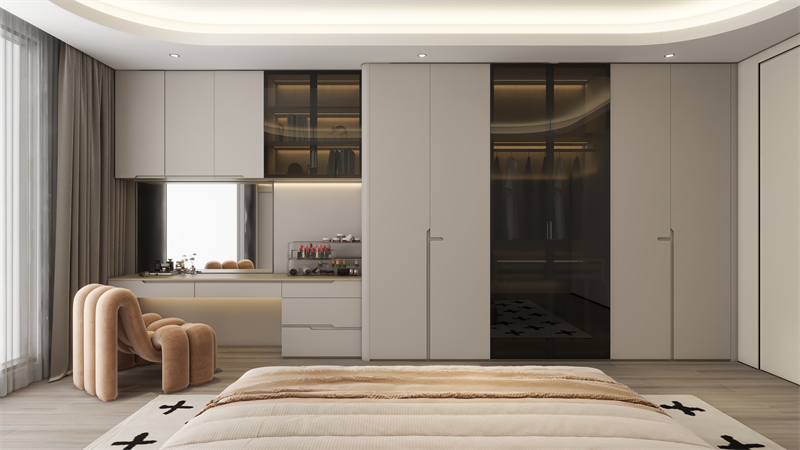 一門到頂衣櫃,嵌入式梳妝台一體化設計更省空間,在滿足衣物收納的同時,亦解決日常美妝、辦公學習的需求。
