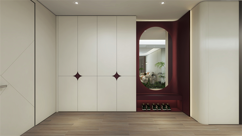 圓弧形的轉折處理,使得玄關區域在視覺上更加流暢與連貫,宛如自然延伸出的一個優雅弧度,引領家人順暢步入家中。下方保留開放式常換鞋區,簡潔實用;圓弧拚接門型搭配“白芷”、“紅鸞”撞色點綴,打破傳統色彩界限,賦予空間柔和而深邃的視覺層次。
