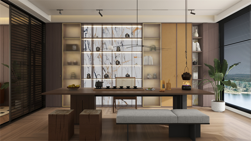 在清淺時光裏,一手煙火一手詩意,任窗外花開花落,雲來雲往,自是餘味無盡,萬般愜意。茶室以素色調為主,深色的天然紋理厚實而流暢,打造質樸的空間,帶來的不僅僅是原始的茶味,更是一種隨性的灑脫意境。