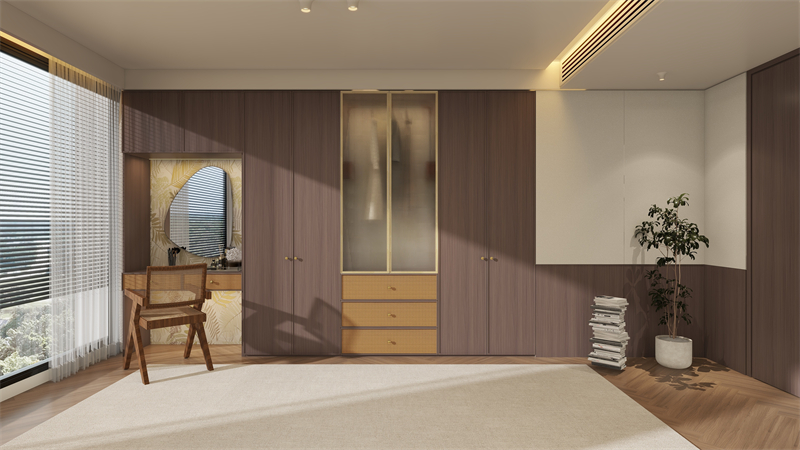 整個空間以深色木紋打底,大麵積的木紋拚框櫃門,既保留中古經典特色,也兼備古典與現代美感。衣櫃局部應用長虹玻璃,嵌入梳妝台,搭配內嵌燈帶,透光不投影的朦朧感,驚豔每一天。