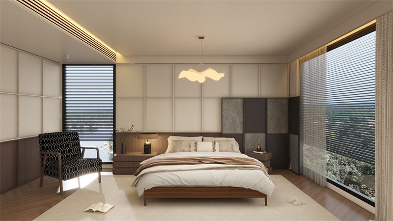 溫潤柔和的臥室空間,捕捉記憶與情感的詩意,陳述著過去與未來的情愫。床頭背景牆采用凹凸有致、細膩流暢的骨骼線與拚色護牆板,讓空間呈現多維立體的藝術美。落地窗讓陽光灑進來,整個空間都亮了起來,感覺走進了溫暖的夢境。