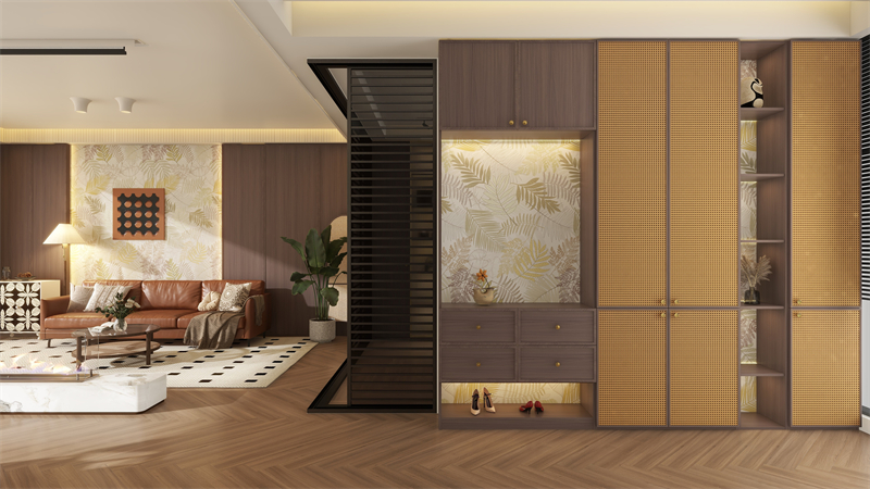 微醺濾鏡下的中古風,從入戶起就開始鋪墊複古的基調。胡桃木紋理搭配咖啡色藤編,讓古樸的氣息從玄關開始,彌漫家中每個角落,以複古高級的腔調為畫筆,勾勒出自帶電影氛圍感的空間,打造富有享受的視覺空間。
