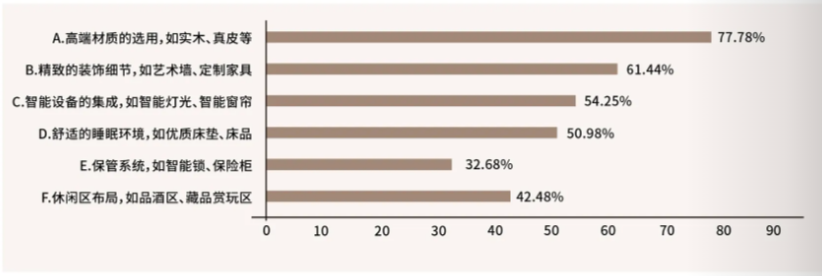 《中國臥室生活方式洞察報告》顯示,臥室生活占據人生至少三分之一的時間,其舒適度和功能性對提升生活質量至關重要,不同人群對於臥室生活的需求是不一樣的。在打造高品質臥室方麵,高淨值人群尤其注重高端材質的選用、精致的裝飾細節以及智能化設備的應用。具體來看,77.78%的受訪者認為高端材質不可或缺,61.44%的人認為精致細節同樣重要。