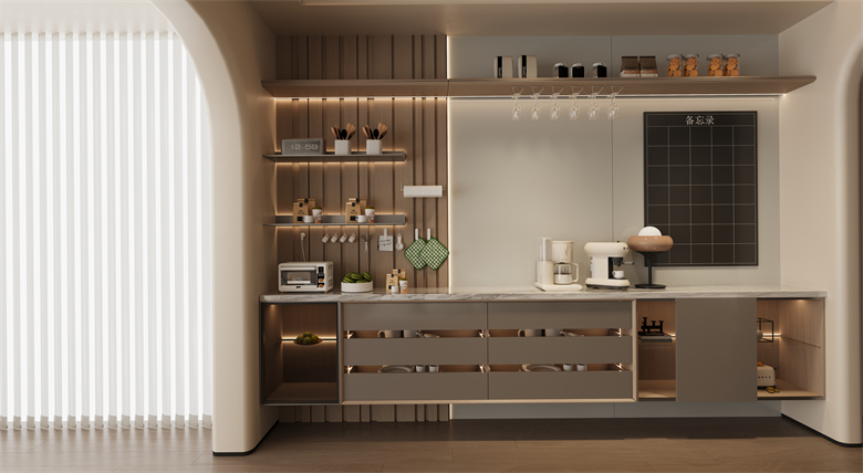 布局設計上,羅亞全屋定製更是打破了家居就該有固定模樣的陳規。餐廳與陽台不再是割裂的存在,而是被打造成聯動的“咖啡區 + 品酒區”;早晨在這裏衝一杯手衝,用咖啡香喚醒元氣;夜晚調一杯利口酒,讓微醺消解疲憊。