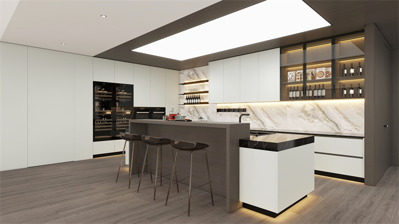 細節處亦見匠心,魔方皮紋內嵌拉手門型搭配拉絲黑拉手,將極簡融入基因,門板與拉手渾然一體;可選配的海蒂詩、百隆等進口鉸鏈,讓每一次開合都安靜順滑,這份 “看不見的用心” 正是其 “懂設計” 的底氣。