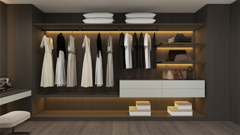 衣帽間以極簡疏闊布局,楓沙木、生椰灰與榛果咖搭配,讓衣物、鞋子被溫柔對待,挑選穿搭成了 “欣賞小確幸” 的過程。羅亞全屋定製用 C 調係列證明:好的定製讓家與生活同頻,其 “懂設計,有顏值” 的背後,是對年輕人生活態度的尊重與品質的堅守。