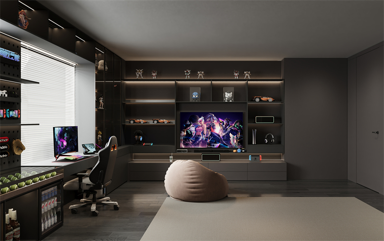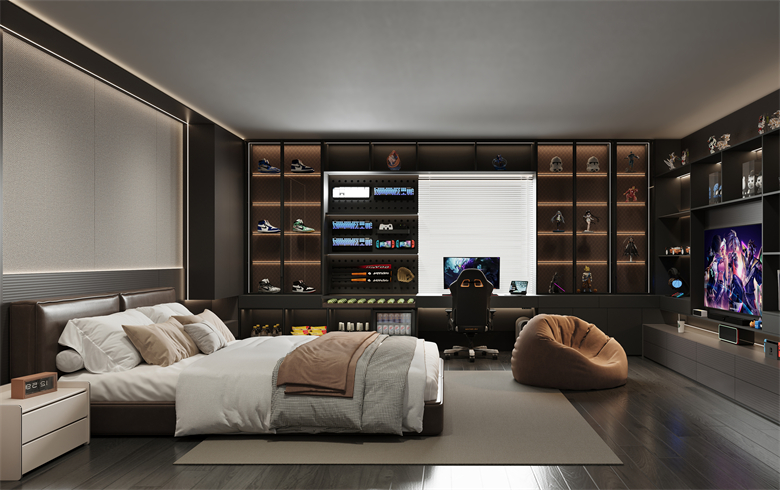 就連臥室也被賦予 "超級玩家" 的屬性 —— 睡眠區的靜謐、收納區的有序、電競區的熱血、娛樂區的鬆弛,四大功能分區精準匹配新貴們的多元需求。睡眠區以降噪牆板與恒溫床墊構建靜謐結界,卸下白日疲憊時,連呼吸都變得輕盈;收納區的隱藏式櫃體與模塊化格架,讓潮玩手辦、電競裝備各得其所,視覺上的整潔感本身就是種治愈。