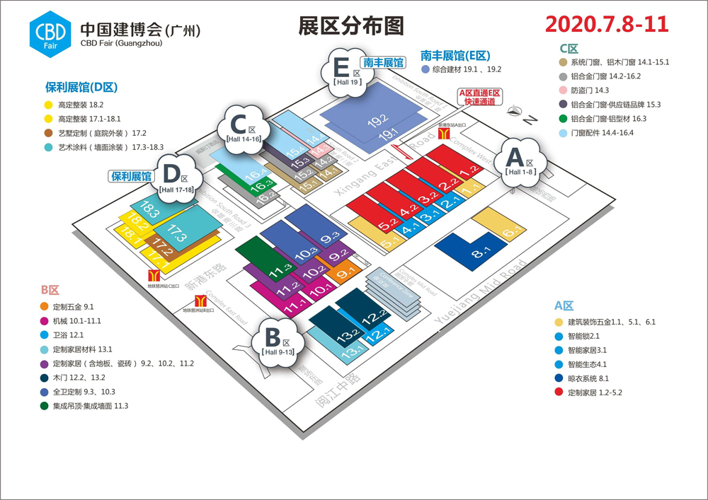 2020年廣州建博會地點有三個展館:廣交會展館、保利世貿博覽館、南豐國際會展中心(下圖為展館分布圖)